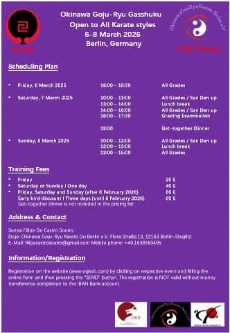 Gasshuku Berlin - Marzo 2026 Comparte en redes Del 6 al 8 de Marzo de 2026 te invitamos a un Gasshuku de Karate-Do Okinawa Goju-Ryu en Berlín (Alemania), abierto a todos los estilos.
